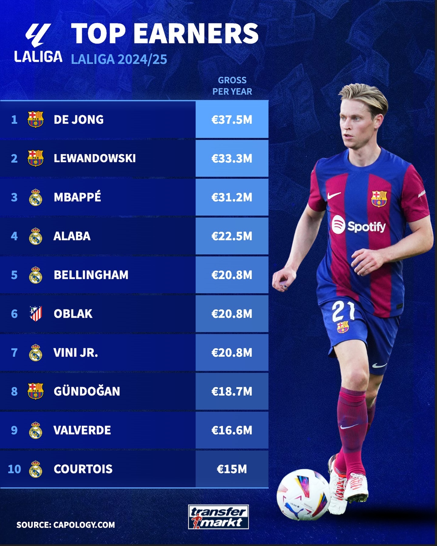 07月23日讯 德转列法甲球员年薪排行,前十都是巴黎球员,登贝莱2000万欧最多。
