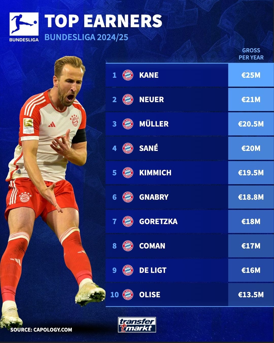7月23日讯 转会市场盘点了下赛季德甲球员中,税前总年薪最高的球员榜单,其中凯恩居首,前十位均来自拜仁。具体如下: