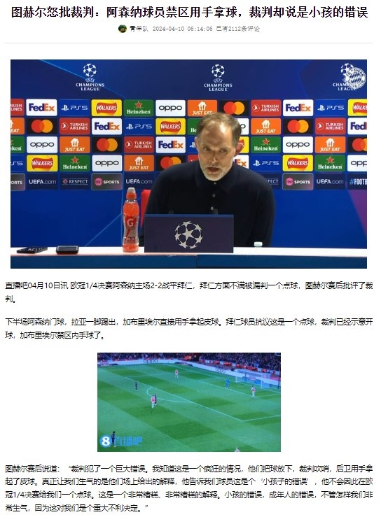 《ESPN》则指出,本场比赛的主裁格伦-尼伯格在4月就曾在吹罚欧冠八强战时出现了引发巨大争议的判罚。欧冠1/4决赛首回合,阿森纳主场2-2战平拜仁,比赛下半场,加布里埃尔禁区内接拉亚传球用手拿球再放下开门球,拜仁将帅大声抗议但裁判没有表示。