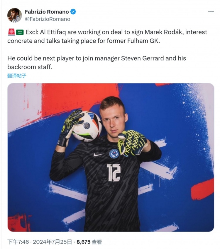 罗马诺:达曼协作有意免签27岁门将罗达克,正与球员谈判