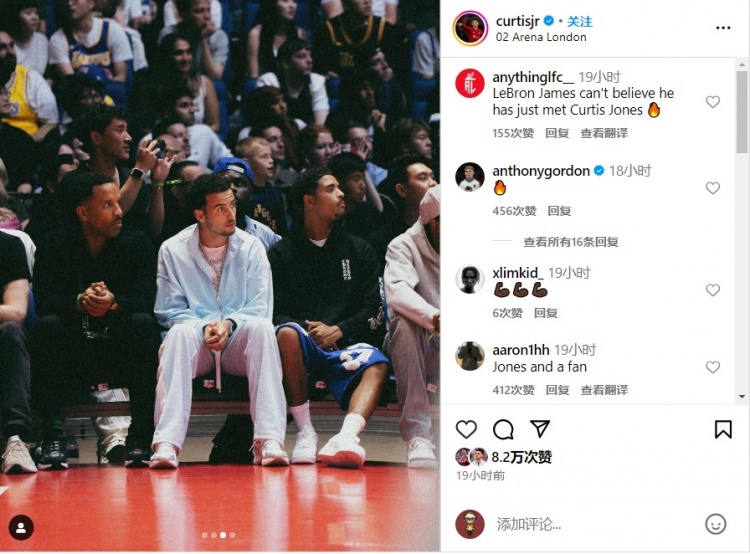 詹姆斯是利物浦的股东之一,柯蒂斯-琼斯今天晒出了自己去看詹姆斯比赛,并与他寒暄的照片。