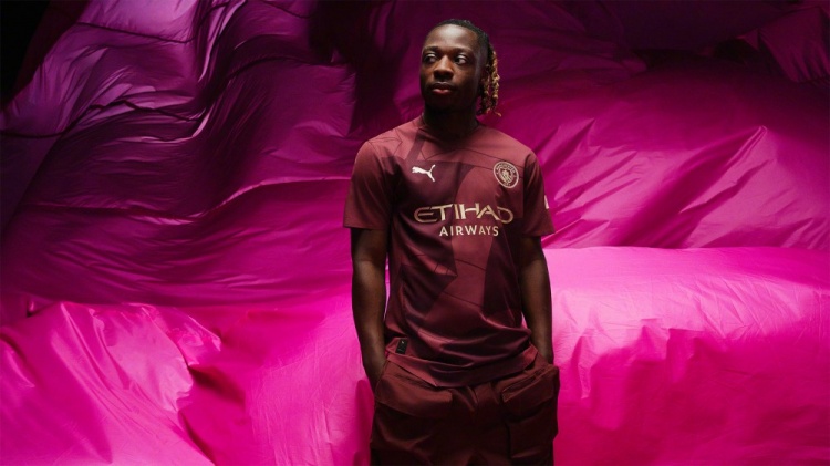 曼城发布了2024-2025赛季的第二客场球衣,该款球衣主色调为勃艮第色(酒红色),队徽、赞助商等标志为金色,曼城队徽的船型图案覆盖在球衣上。