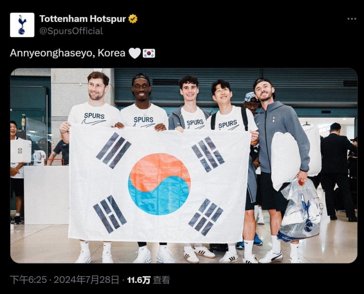 热刺抵达韩国将对阵K联赛全明星,官方晒照“阿尼哈塞哟,Korea”