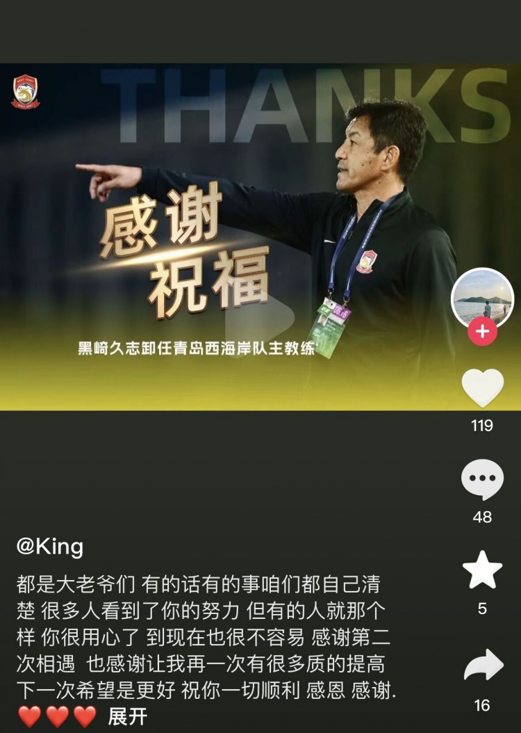 7月30日讯 在青岛西海岸俱乐部官宣黑崎久志下课后,西海岸后卫宋博为在社媒发文向黑崎久志告别。