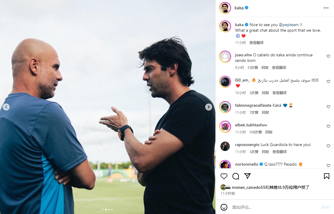 卡卡社媒晒与瓜帅合影:很高兴见到你!多么棒的一次聊天