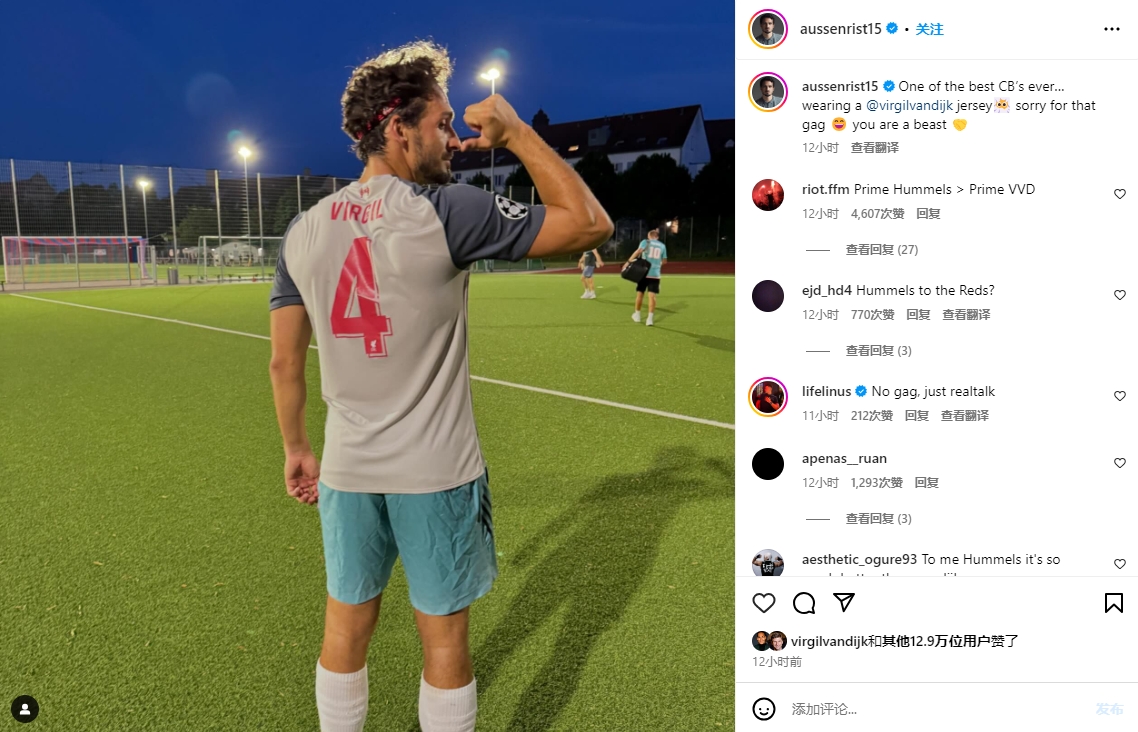 胡梅尔斯社媒晒穿范迪克球衣:史上最佳中卫之一&你是一头野兽