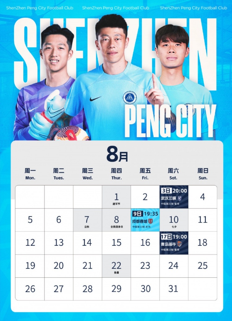 保存这份月历,规划好你的八月,让我们一起为深圳新鹏城加油助威,共同迎接胜利的时刻!⚽