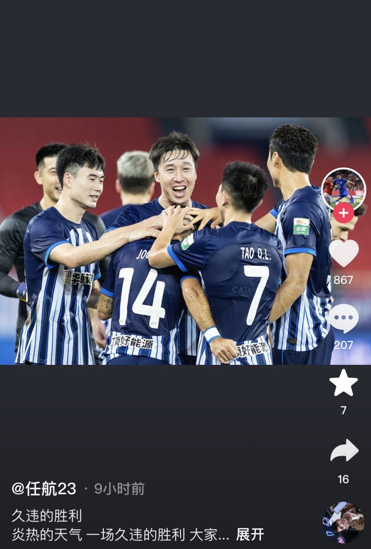 8月4日讯 昨晚进行的中超第21轮比赛,武汉三镇主场4-1击败深圳新鹏城。赛后,三镇队长任航在社媒进行了庆祝。