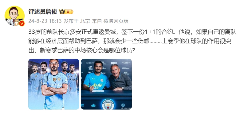 詹俊写道:33岁的前队长京多安正式重返曼城,签下一份1+1的合约。他说,如果自己的离队能够在经济层面帮助到巴萨,那就会少一些伤感.........上赛季他在球队的作用很突出,新赛季巴萨的中场核心会是哪位球员?