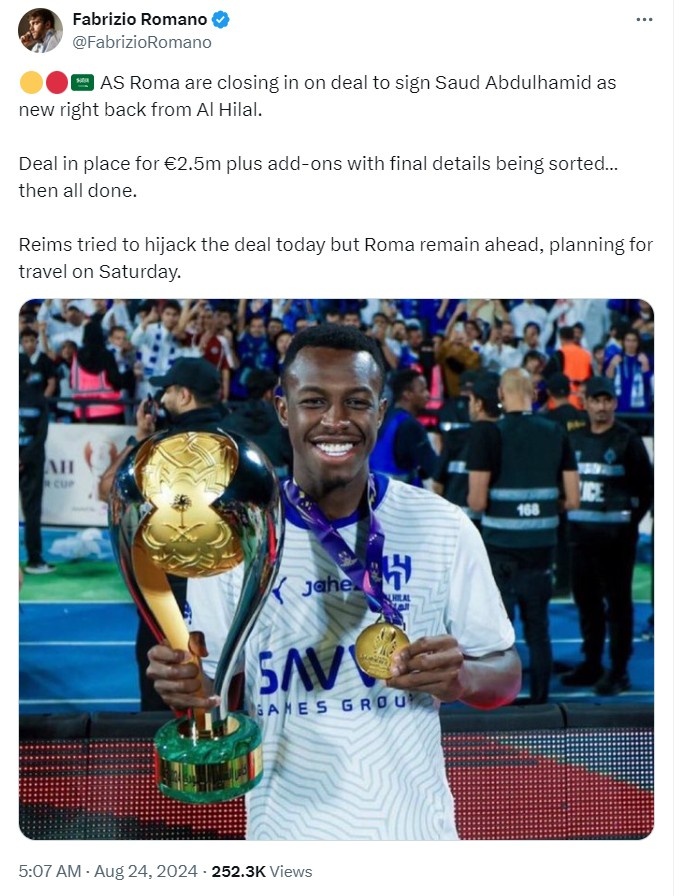 8月24日讯 罗马诺消息,罗马接近从利雅得新月签下阿卜杜勒哈米德作为新的右后卫。