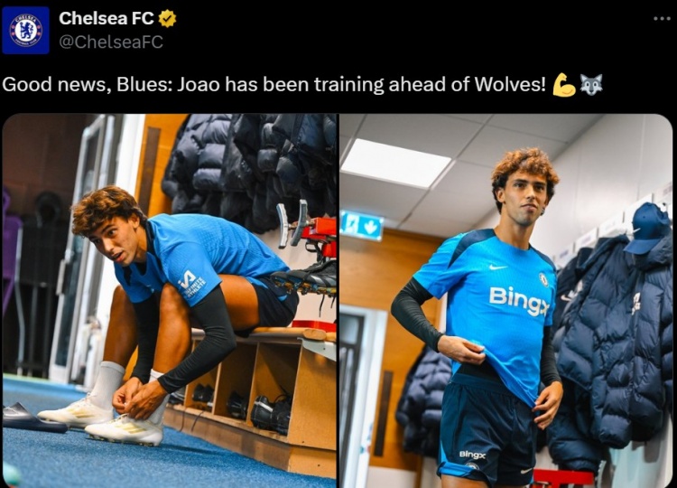 8月24日讯 切尔西官推晒出菲利克斯准备参加球队训练的照片,配文写道:“好消息,蓝军球迷们,菲利克斯参加了球队对阵狼队之前的训练!”