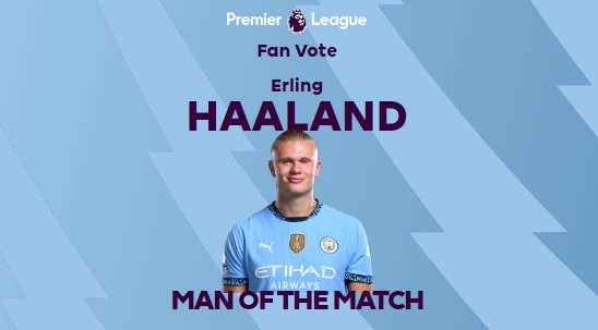 哈兰德获得了球迷87%的投票,当选本场比赛的全场最佳球员,排在第二的是传射建功的德布劳内,他的得票率为7.1%。