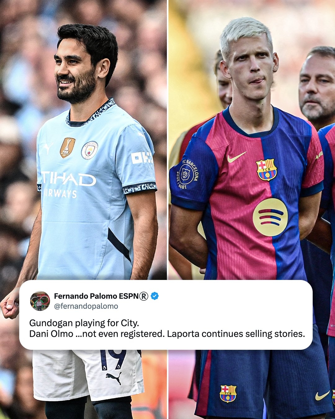 记者Fernando Palomo也发文调侃:京多安为曼城出战,奥尔莫......甚至还没注册,拉波尔塔继续着他的出售故事。