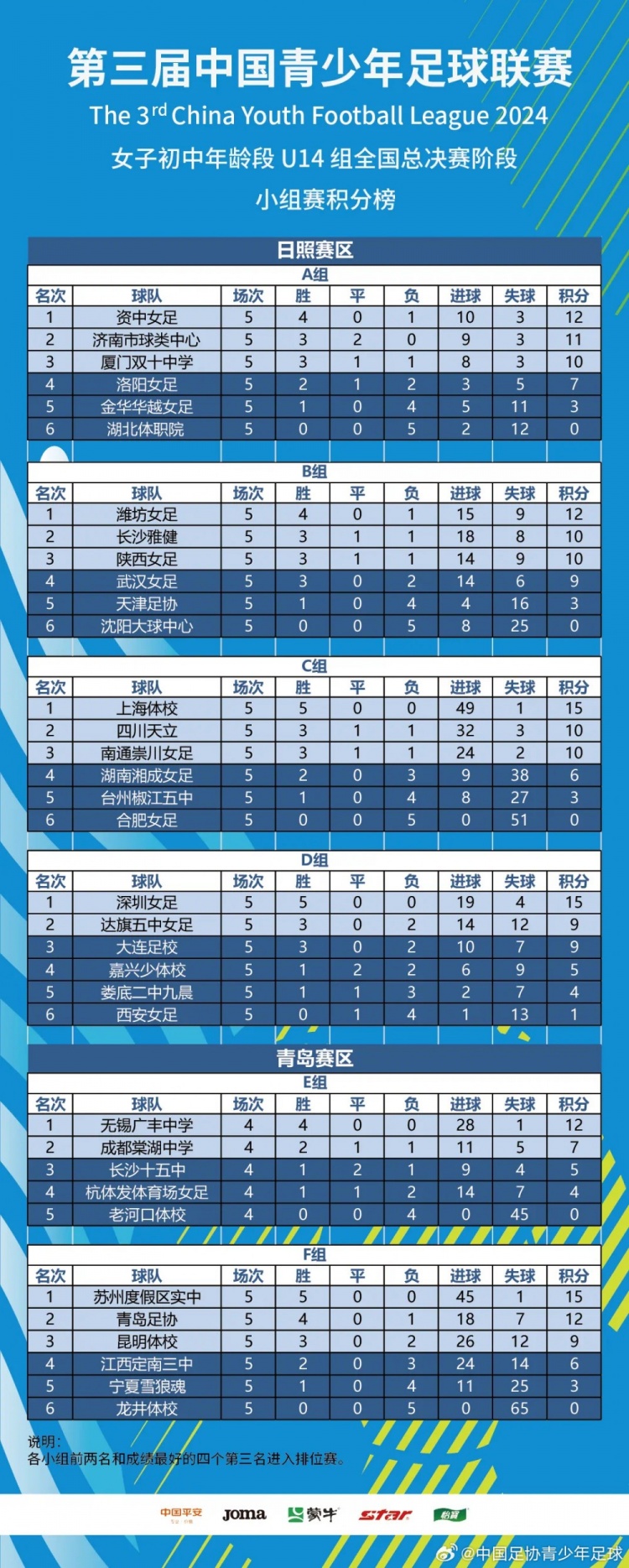 2024年第三届中青赛女子初中年龄段U14组总决赛1/8决赛对阵+小组赛积分榜