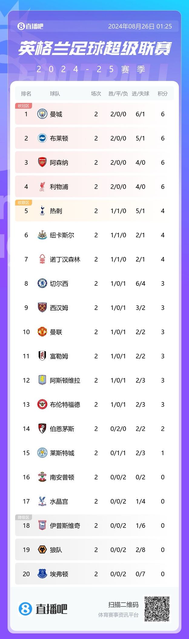 英超积分榜:曼城&布莱顿&阿森纳&利物浦两连胜占前四 曼联第10