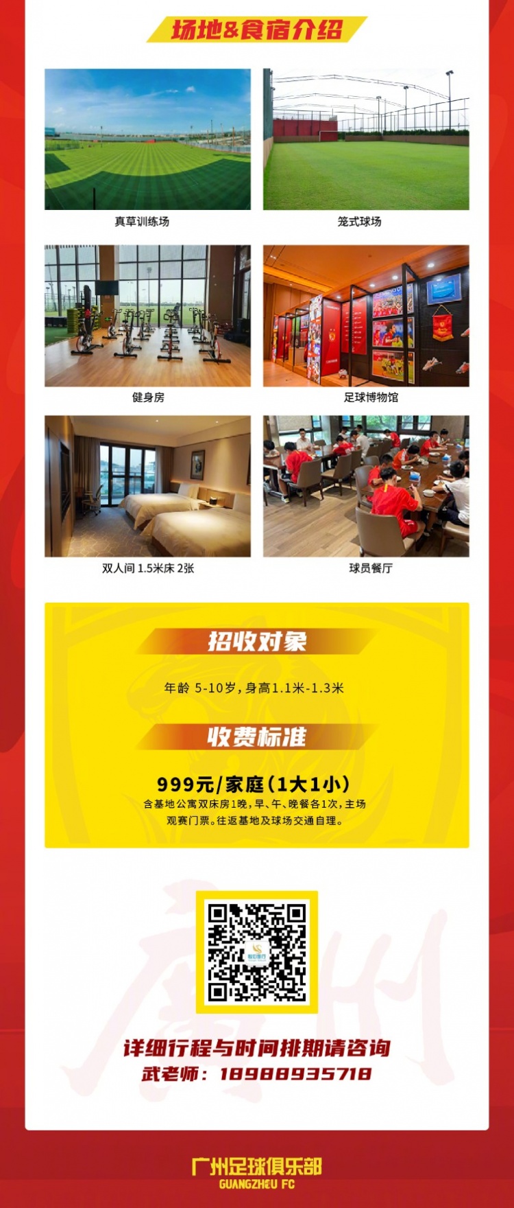 8月26日讯 广州队官方推出亲子观赛体验营,每个家庭1大1小收费999元,含基地公寓双床房1晚,早、午、晚餐各1次,主场观赛门票。往返基地及球场交通自理。
