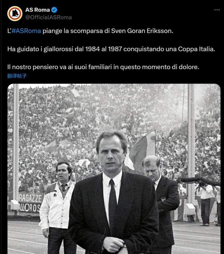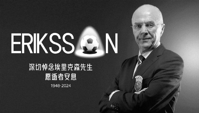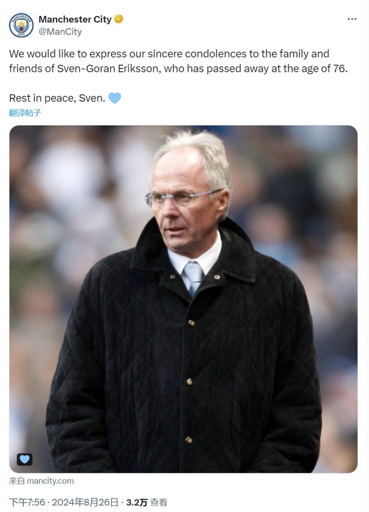曼城悼念名帅埃里克森:向斯文的家人和朋友表示诚挚的哀悼