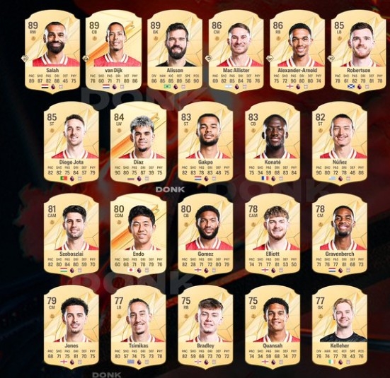 利物浦球员FC25能力值泄露:萨拉赫&范迪克&阿利森89并列最高