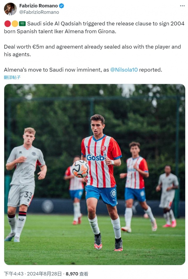 8月28日讯 据知名记者罗马诺的消息,沙特俱乐部卡迪西亚将以500万欧签下赫罗纳小将阿尔梅纳。