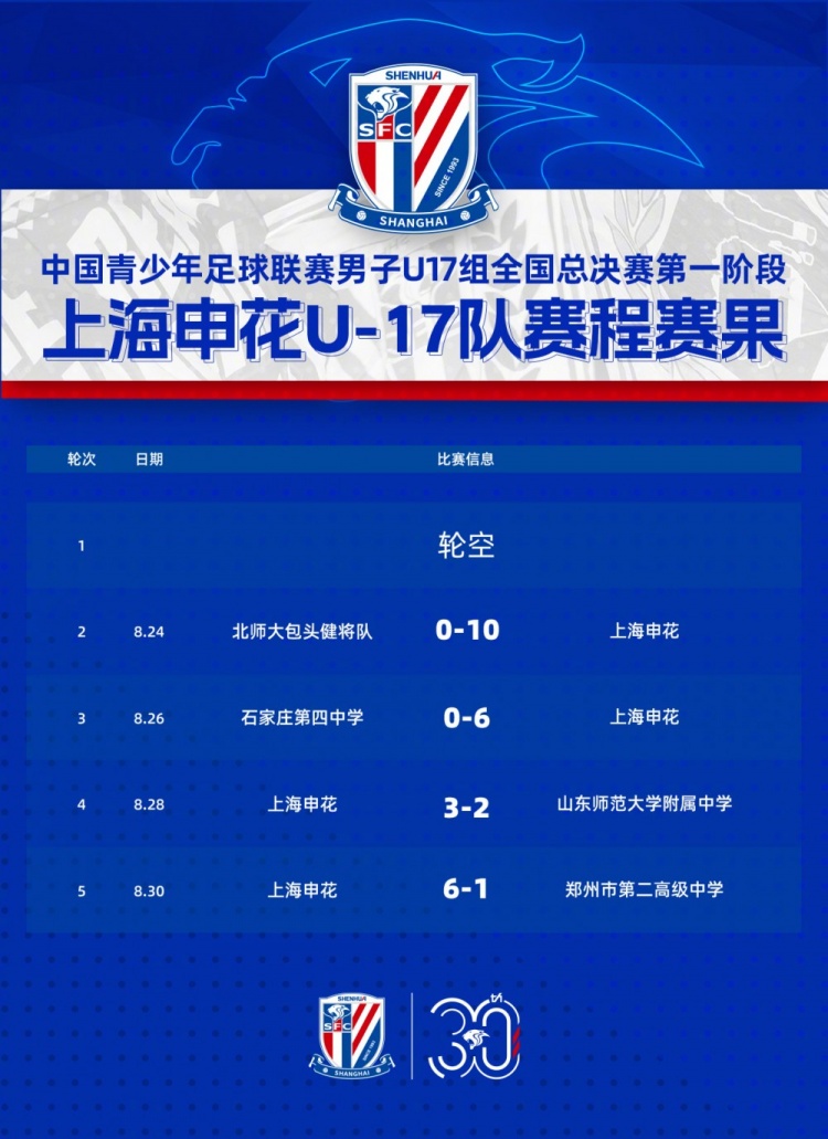 由陶金指导率领的上海申花U17队小组赛四战全胜头名晋级将于9月18打响的中青联总决赛第二阶段。