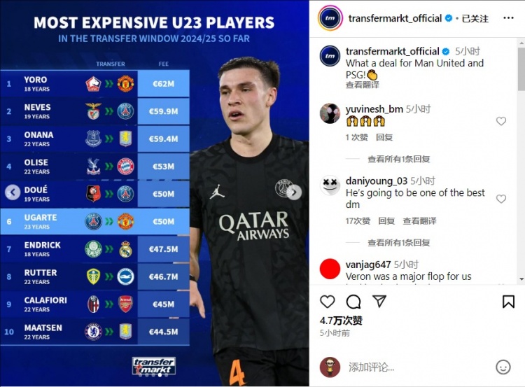 今夏U23球员转会费排行:约罗第一内维斯第二,乌加特上榜