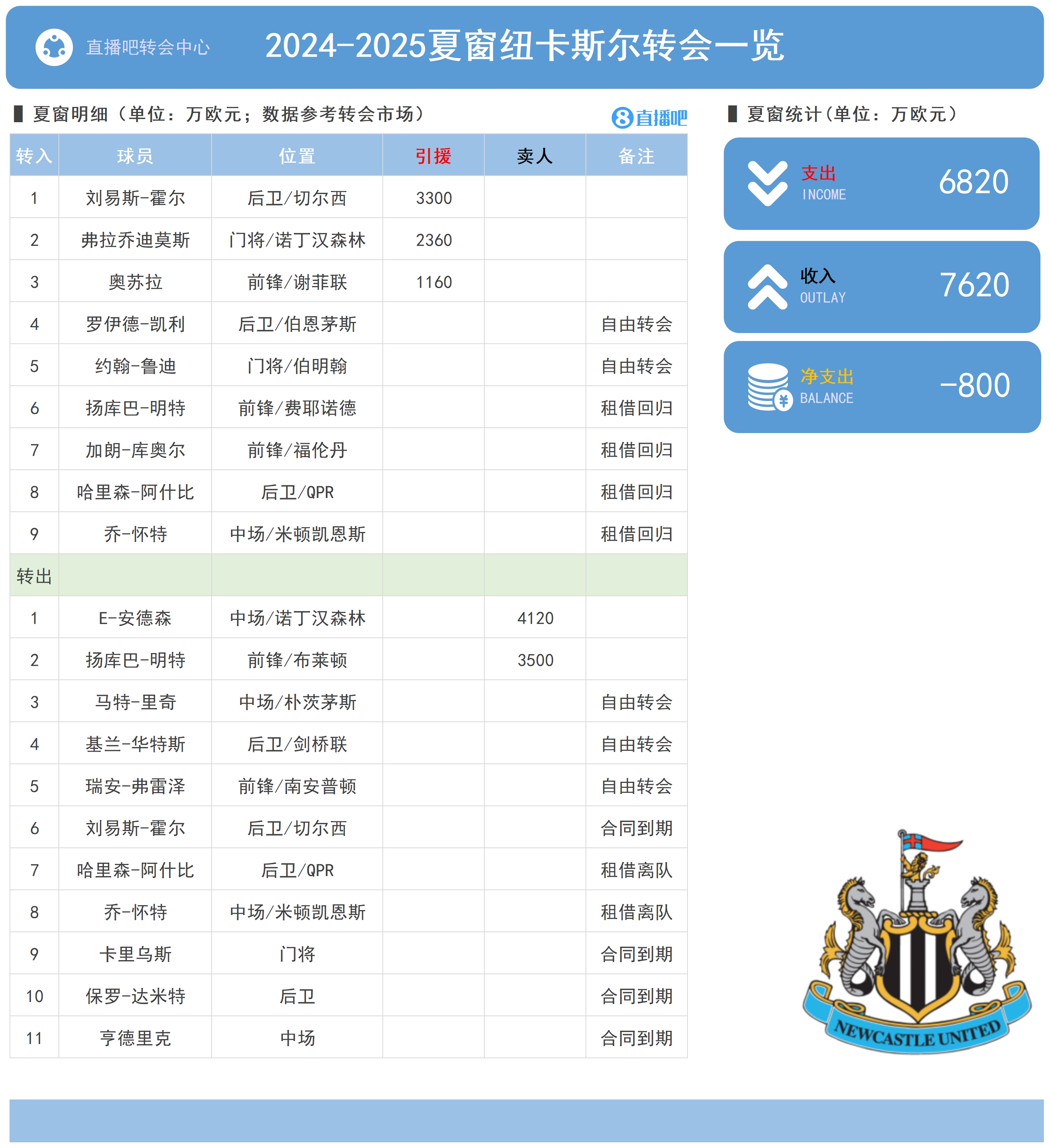 纽卡夏窗:6820万欧引进霍尔等人,出售安德森、明特收入7620万欧