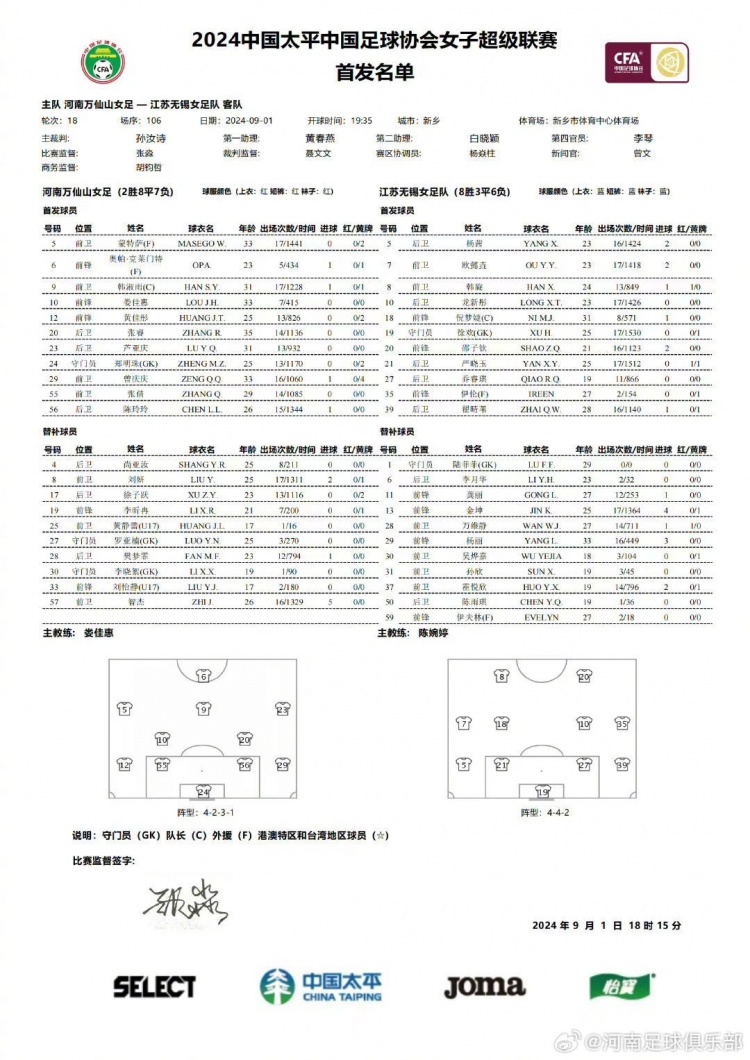 北京时间9月1日19:35,2024中国太平女超联赛第十八轮,河南万仙山女足主场迎战江苏无锡女足。