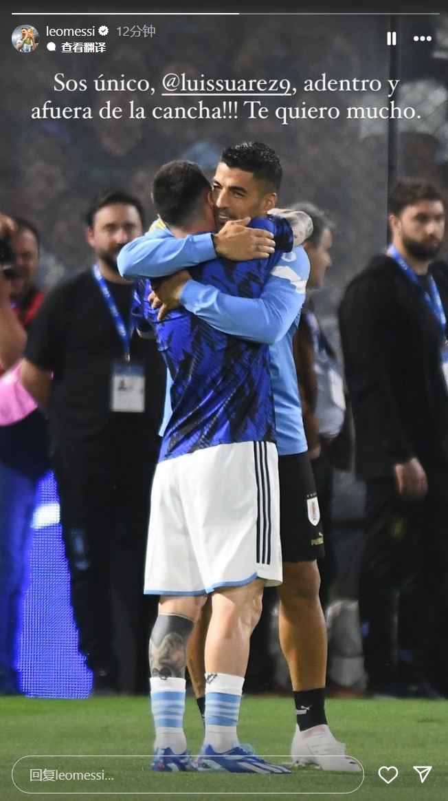 梅西晒出两人在国家队拥抱的合照,表示道:“你是独一无二的@苏亚雷斯,场上场下,我都很爱你。”