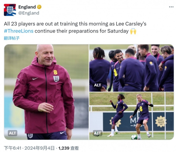 英格兰队23名球员全部参加今日训练,备战对阵爱尔兰、芬兰比赛