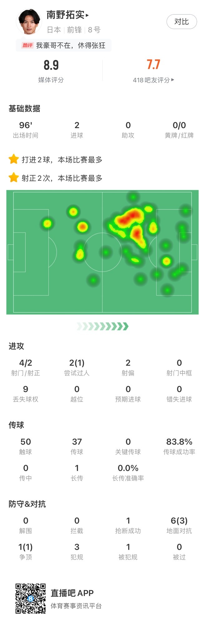 9月5日讯 世预赛18强赛首轮,国足0-7惨败日本,效力于摩纳哥的南野拓实完成梅开二度,赛后他获得了全场第二高的8.9分评分。