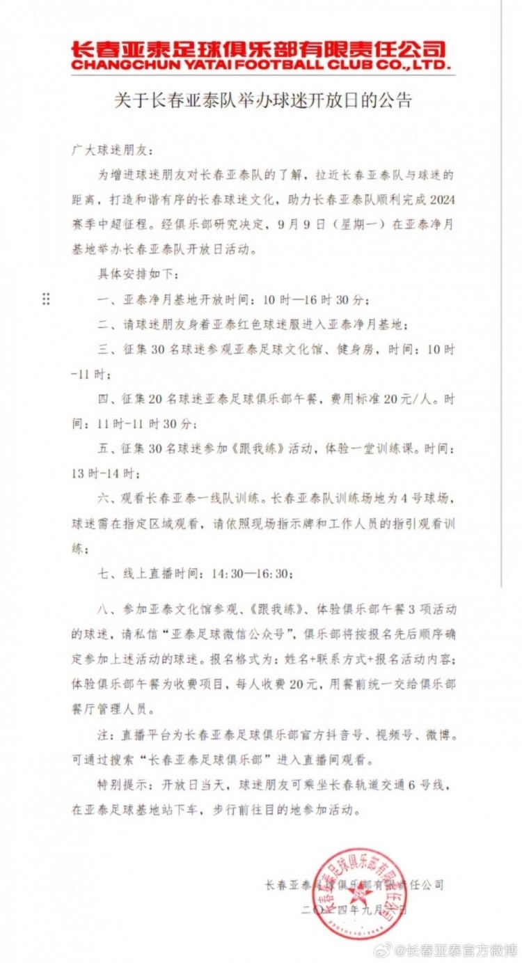 其中,征集30名球迷参观亚泰足球文化馆、健身房,时间为10时至11时;征集20名球迷在亚泰足球俱乐部午餐,费用标准20元/人,时间为11时至11时30分。