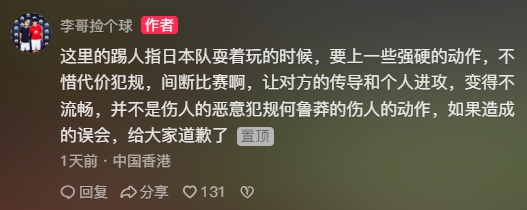 他回应表示:“这里的踢人指日本队耍着玩的时候,要上一些强硬的动作,不惜代价犯规,间断比赛啊,让对方的传导和个人进攻,变得不流畅,并不是伤人的恶意犯规何鲁莽的伤人的动作,如果造成的误会,给大家道歉了”。