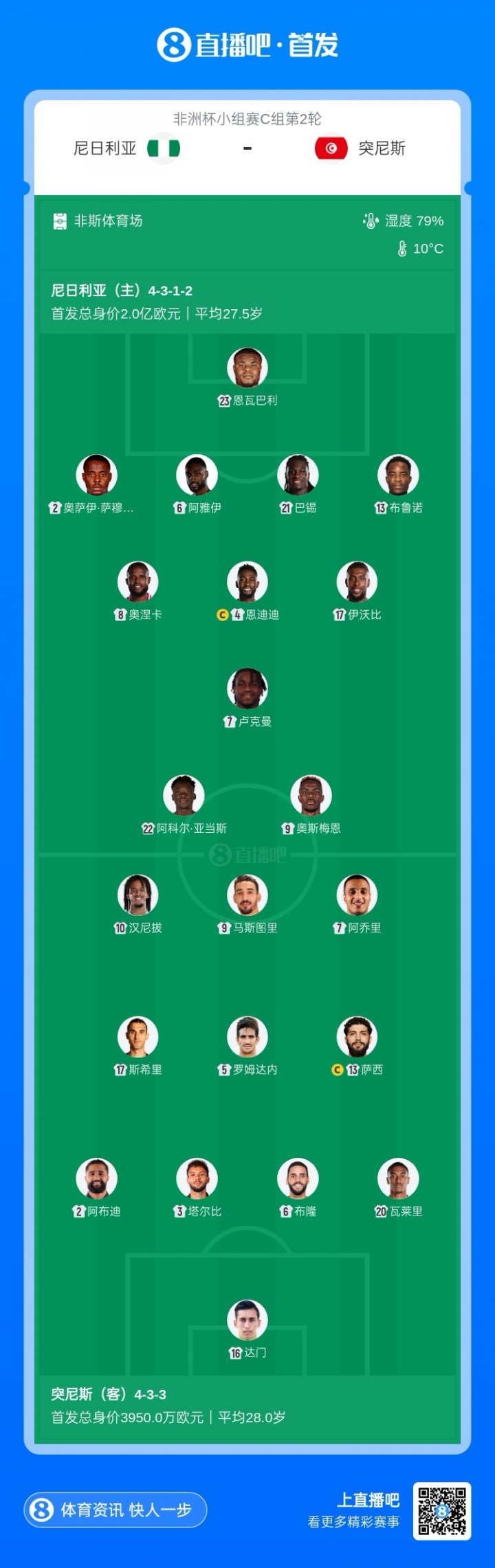12月28日讯 非洲杯小组赛C组第2轮,尼日利亚主场迎战突尼斯,赛前双方首发公布。
