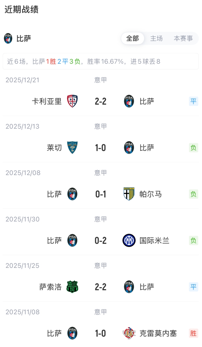 比萨首发:1-森帕、3-安戈里、4-卡拉乔洛、5-卡内斯特雷利、33-卡拉布雷西、32-莫雷奥、21-武拉尔、20-埃比舍尔、15-伊德里萨·图雷、10-特拉莫尼、7-莱里斯