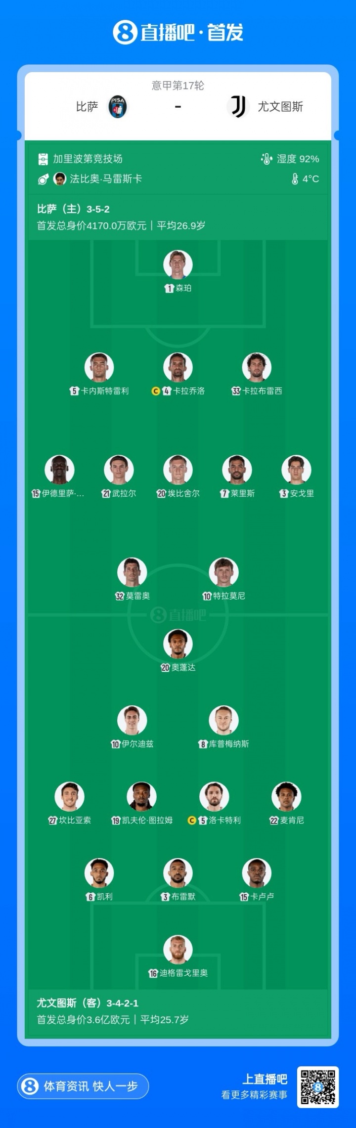 12月28日讯 本轮意甲,比萨主场迎战尤文比赛即将打响。赛前首发出炉。