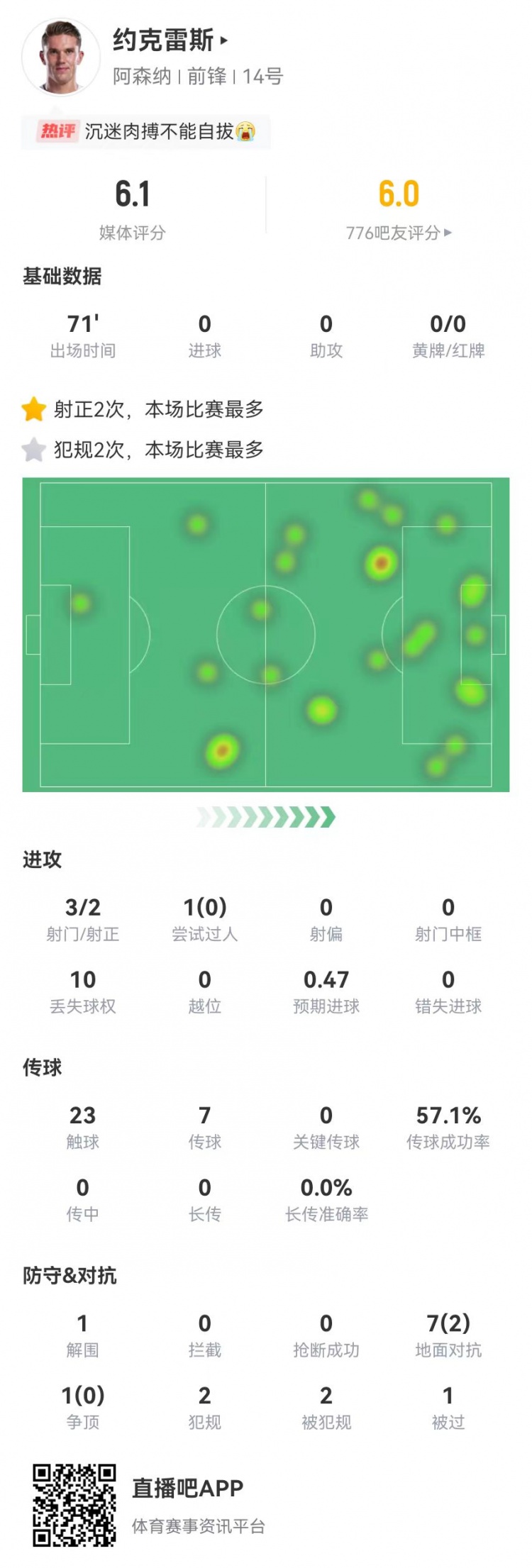 沉迷肉搏?约克雷斯3射2正+8对抗2成功 2犯规2造犯规 获6.1分最低