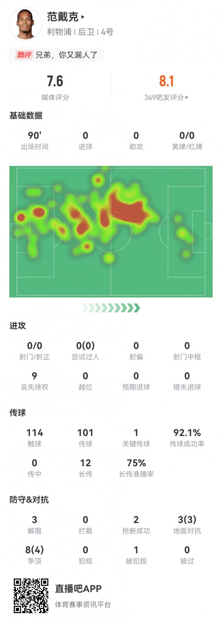 12月28日讯 利物浦在本轮英超对阵狼队,范戴克本场数据如下:
