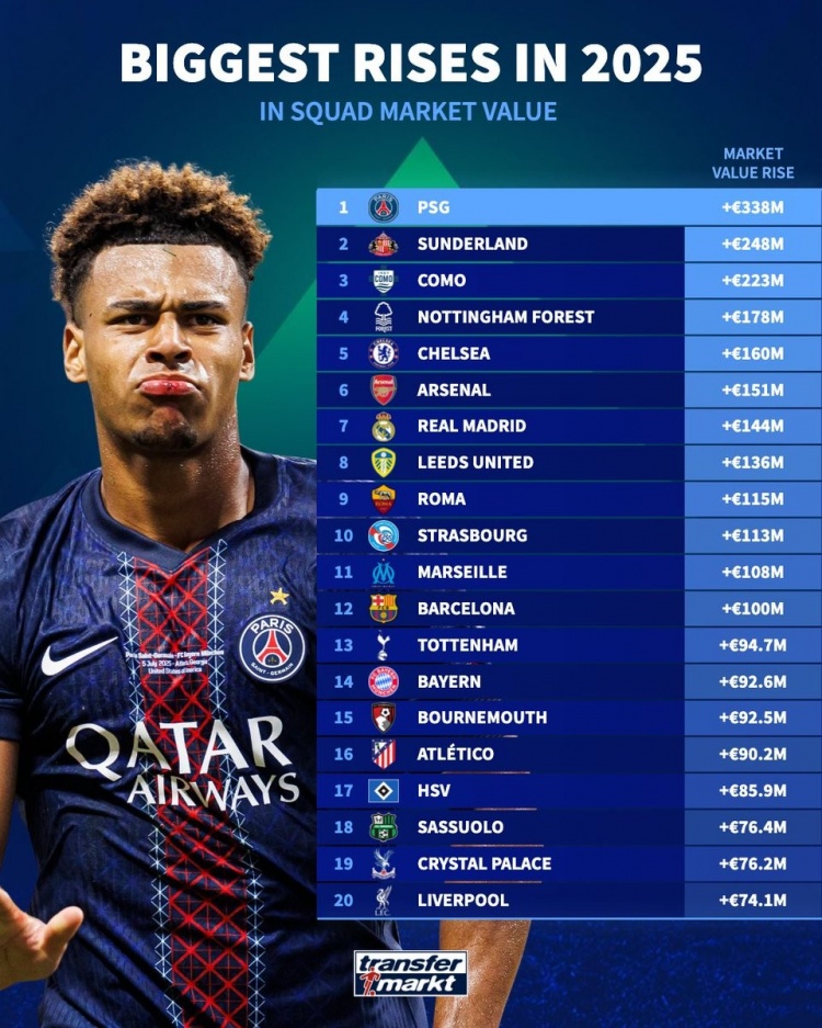 12月28日讯 德转已经更新了各大联赛球员身价,并据此统计了在2025年的俱乐部身价涨幅情况,新科欧冠冠军巴黎领跑。