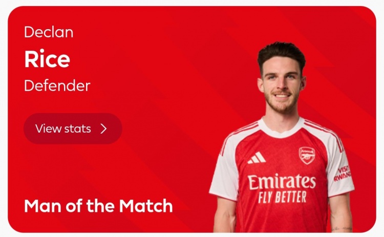 12月28日讯 阿森纳在本轮英超2-1击败布莱顿,赖斯当选全场最佳。