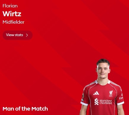 12月28日讯 2025-26赛季英超联赛第18轮,利物浦2-1战胜狼队,本场首发出战的维尔茨赛后当选全场最佳。