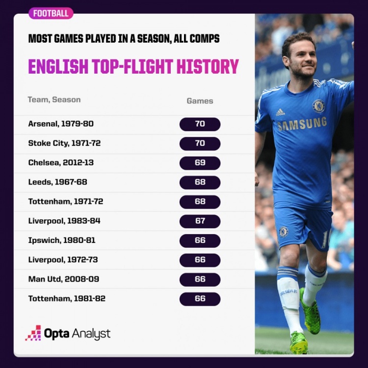 英格兰顶级联赛的历史上,有13支球队在单赛季踢了65场或更多比赛的例子。然而自千禧年以来,只有两支球队单赛季比赛次数超过65场:08/09赛季的曼联(66场)和12/13赛季的切尔西(69场)。
