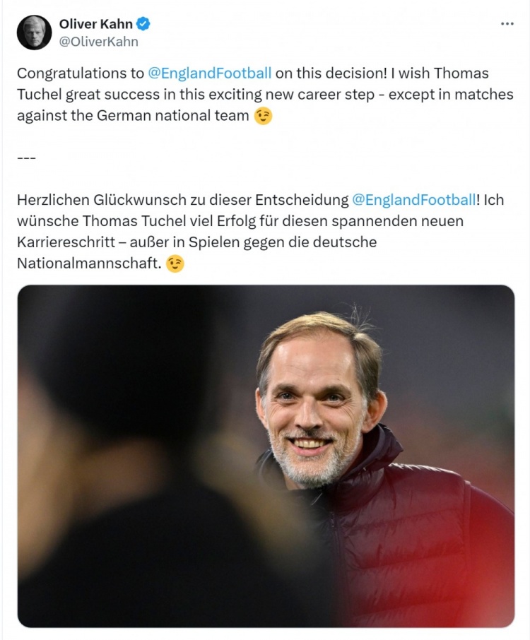 卡恩社媒晒出图赫尔的照片,并写道:“祝贺英格兰队做出这个决定!祝愿图赫尔在这个令人兴奋的执教生涯新阶段中取得巨大成功——除了对阵德国队的比赛。”