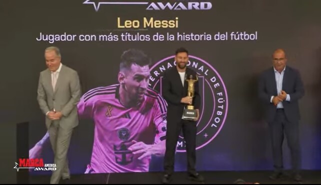 10月18日讯 马卡报在迈阿密主场致敬梅西,为梅西举行颁奖仪式颁发特别奖——马卡美国奖。这一奖项是致敬历史上冠军最多的球员梅西46冠。