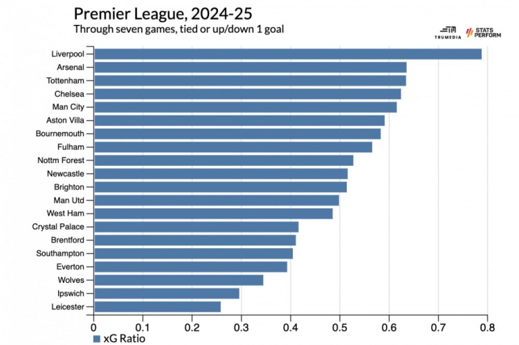 此外,利物浦有85%的预期进球出现在平局的情况下,而其他球队的这一数据从未超过69%。将门槛扩大到平均或者一球以内的比赛,斯洛特的球队仍然遥遥领先于其他对手。