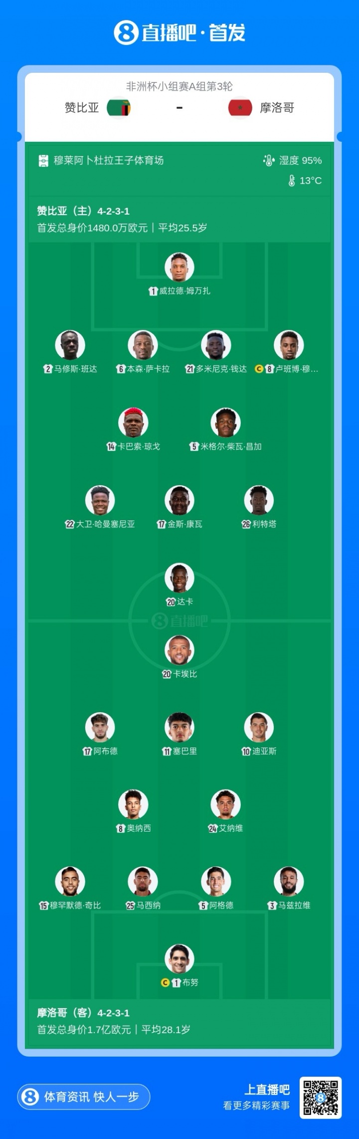 12月30日讯 非洲杯小组赛A组第3轮,摩洛哥客战赞比亚,赛前双方首发公布。
