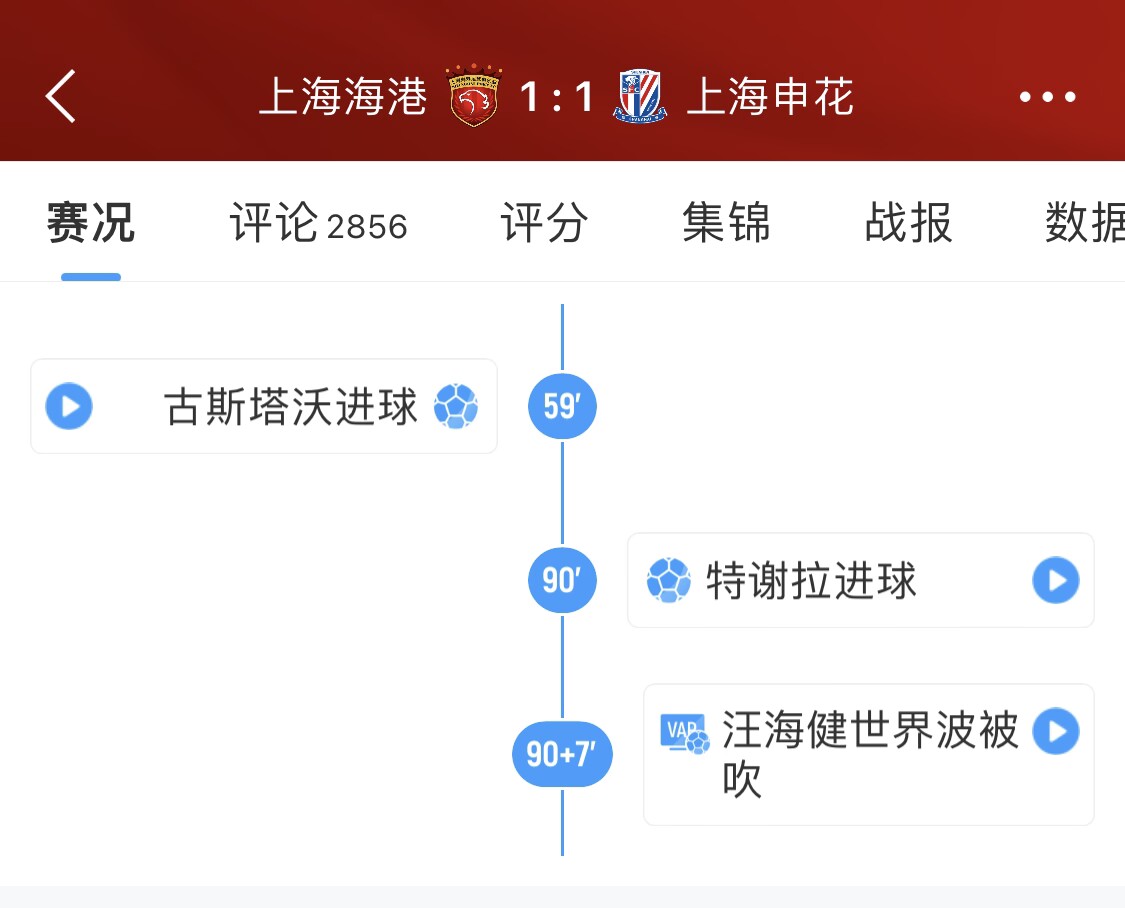 上海海港1-1上海申花(特谢拉第90分钟绝平)