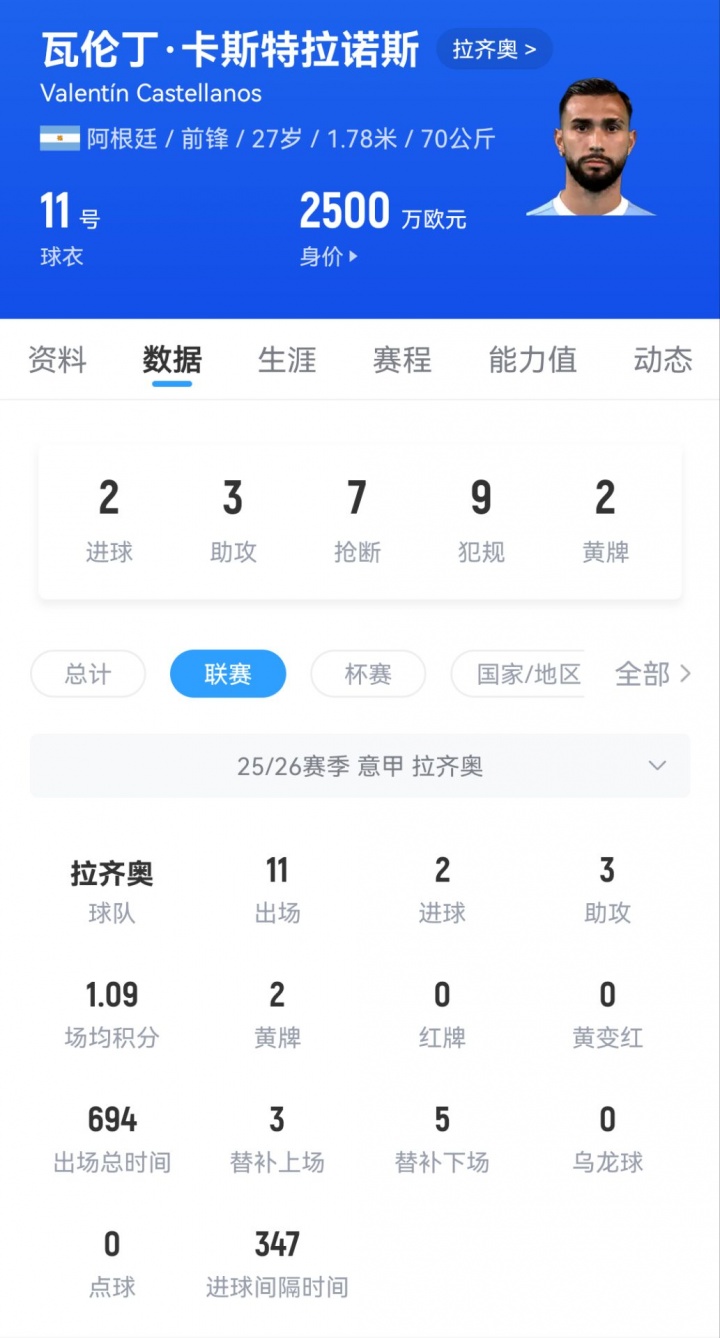 卡斯特拉诺本赛季为拉齐奥在意甲出战了11场,有2球3助,现在转会市场为他的估值为2500万欧元。