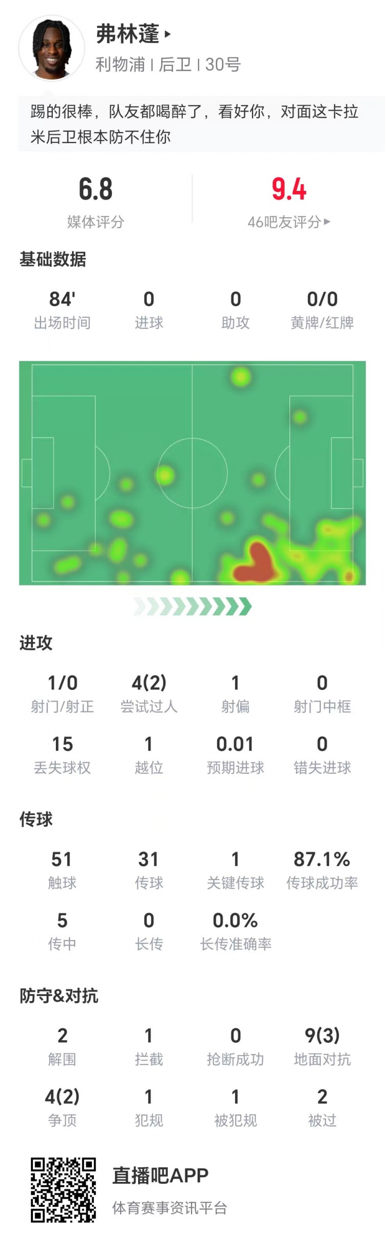 弗林蓬数据:1射零正,1次关键传球,获评6.8分