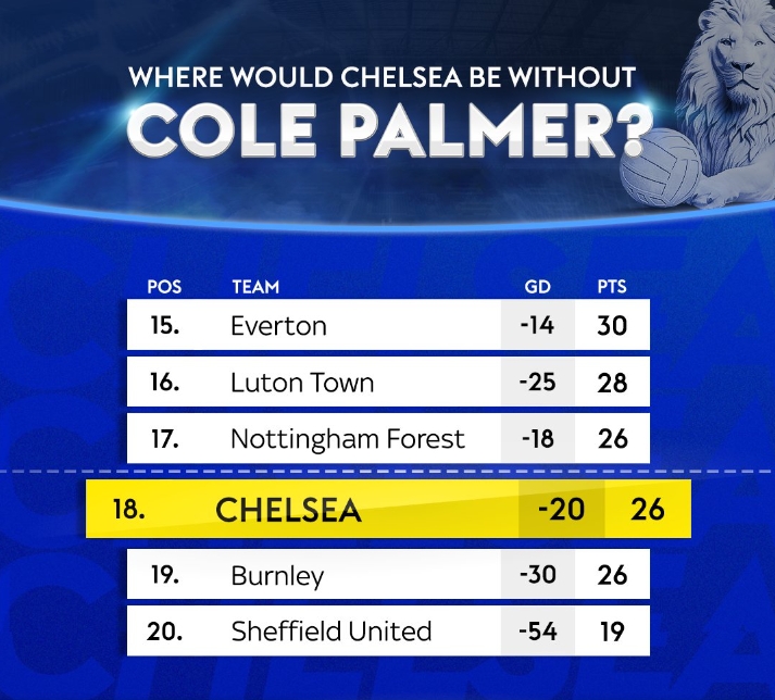 04月24日讯 英超第29轮补赛,切尔西客场0-5不敌阿森纳。赛后英媒统计,如果没有帕尔默贡献的29球(20球9助),切尔西将处于降级区。但这一言论却遭到了蓝军球迷的回怼。