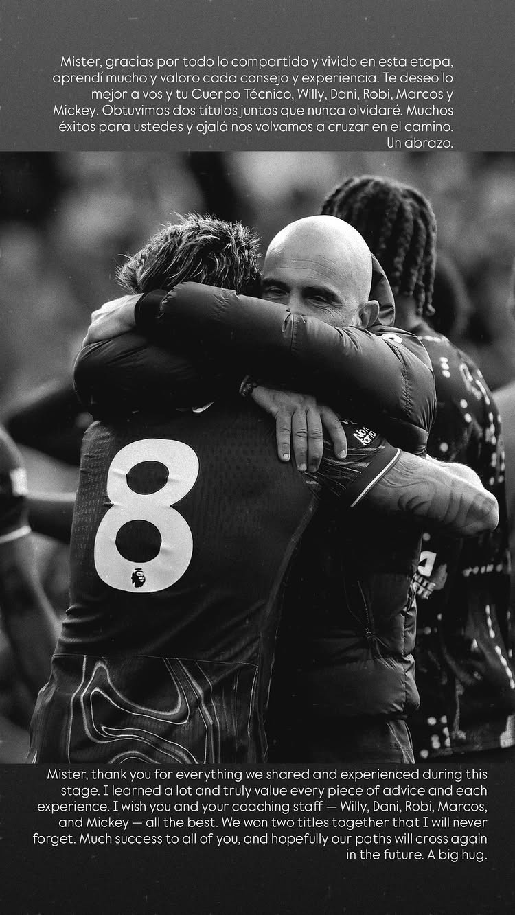 恩佐表示:“先生,感谢您在这段时间里与我们分享和经历的一切。我受益匪浅,您给我的每一条建议和每一次经历都弥足珍贵。”